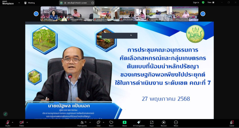 วันที่ 27 พฤษภาคม 2568 เวลา 09.30 น. นายณัฐพล แป้นนอก ผู้ตรวจราชการกรม เขตตรวจราชการที่ 11 13 และ 14 เป็นประธานคณะอนุกรรมการคัดเลือกสหกรณ์และกลุ่มเกษตรกรต้นแบบที่น้อมนำหลักปรัชญาของเศรษฐกิจพอเพียงไปประยุกต์ใช้ในการดำเนินงาน ระดับเขต คณะที่ 7 พร้อมด้วยคณะอนุกรรมการฯ และเจ้าหน้าที่ผู้เกี่ยวข้อง เข้าร่วมประชุมฯ ณ ห้องประชุมผู้ตรวจราชการกรม อาคาร 1 ชั้น 6 กรมส่งเสริมสหกรณ์ (เทเวศร์) และ ผ่านระบบ Zoom Meeting
