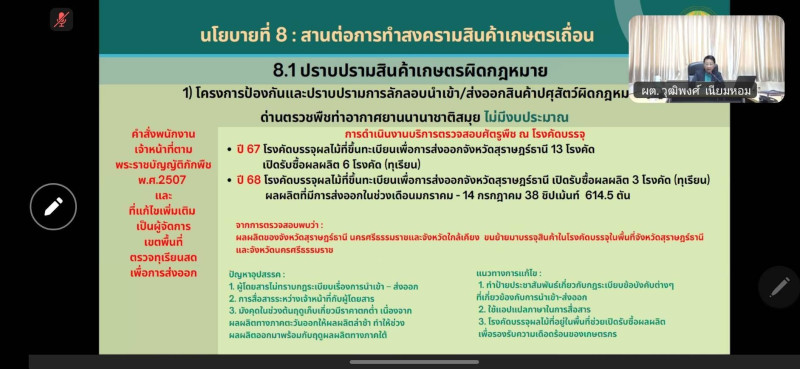 วันที่ 16 กรกฎาคม 2568 นายรุ่งโรจน์ สรวุฒิพิบูลย์ ผู้ตรวจราชการกรม เขตตรวจราชการส่วนกลาง และเขตตรวจราชการที่ 5 พร้อมด้วย นายประเสริฐศักดิ์ ณ นคร สหกรณ์จังหวัดสุราษฎร์ธานี เข้าร่วมการประชุมติดตามผลการดำเนินงานโครงการตามแผนการตรวจราชการของผู้ตรวจราชการกระทรวงเกษตรและสหกรณ์ (นายวุฒิพงศ์ เนียมหอม) ประจำปีงบประมาณ พ.ศ. 2568 ของจังหวัดสุราษฎร์ธานี รอบที่ 2 ผ่านระบบการประชุม Zoom meeting ณ สำนักงานสหกรณ์จังหวัดสุราษฎร์ธานี