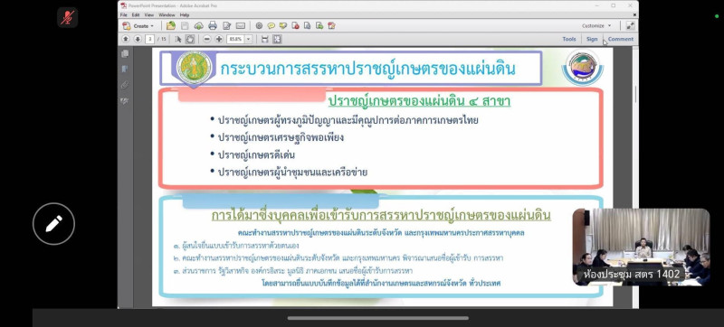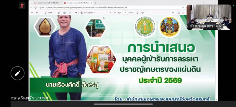 วันที่ 10 พฤศจิกายน 2568 (ช่วงบ่าย) นายณัฐพล แป้นนอก ผู้ตรวจราชการกรม เขตตรวจราชการที่ 11 13 และ 14 ร่วมประชุมคณะทำงานสรรหาปราชญ์เกษตรของแผ่นดินระดับเขต เขตตรวจราชการที่ 13 ประจำปี 2569 ผ่านระบบประชุมทางไกลออนไลน์ (Zoom Meeting) โดยมีนายศรัญญู พูลลาภ ผู้ตรวจราชการกระทรวงเกษตรและสหกรณ์ เป็นประธานในการประชุม