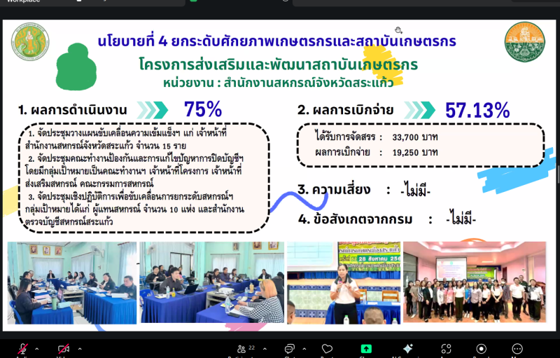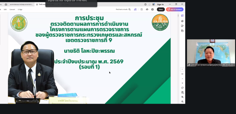 วันที่ 11 มีนาคม 2569 (ช่วงบ่าย) นายณัฐพล แป้นนอก ผู้ตรวจราชการกรม เขตตรวจราชการที่ 9, 11 และ 13 เข้าร่วมการประชุมติดตามผลการดำเนินงานโครงการตามแผนการตรวจราชการของผู้ตรวจราชการกระทรวงเกษตรและสหกรณ์ ประจำปีงบประมาณ พ.ศ. 2569 รอบที่ 1 (จังหวัดสระแก้ว) ร่วมกับหัวหน้าส่วนราชการในสังกัดกระทรวงเกษตรและสหกรณ์ โดยมี นายธิติ โลหะปิยะพรรณ ผู้ตรวจราชการกระทรวงเกษตรและสหกรณ์ เป็นประธานการประชุม ผ่านระบบออนไลน์ Zoom Meeting