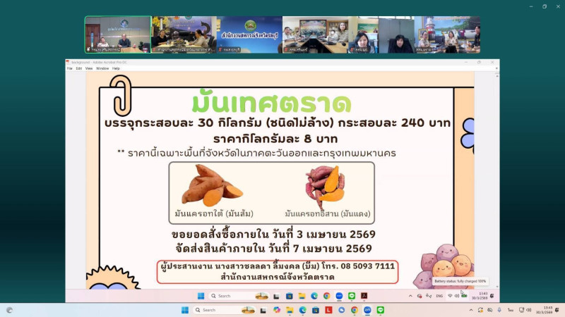 วันที่ 30 มีนาคม 2569 นายณัฐพล แป้นนอก ผู้ตรวจราชการกรม เขตตรวจราชการที่ 9 11 และ 13 พร้อมด้วยนายศุภธีร์ อยู่วัฒนา ผู้ตรวจราชการกรม เขตตรวจราชการที่ 8 และ 18 เข้าร่วมการประชุมหารือมาตรการช่วยเหลือเกษตรกรผู้ปลูกมันเทศในพื้นที่จังหวัดตราด โดยมี สหกรณ์จังหวัด/ผู้อำนวยการกลุ่มพัฒนาธุรกิจ/เจ้าหน้าที่ที่เกี่ยวข้องจากจังหวัดในเขตตรวจราชการที่ 8, 9, 11 และ 13 เข้าร่วมประชุมผ่านระบบ Zoom Meeting ถ่ายทอดสัญญาณจากศูนย์เทคโนโลยีสารสนเทศและการสื่อสาร กรมส่งเสริมสหกรณ์ (เทเวศร์)